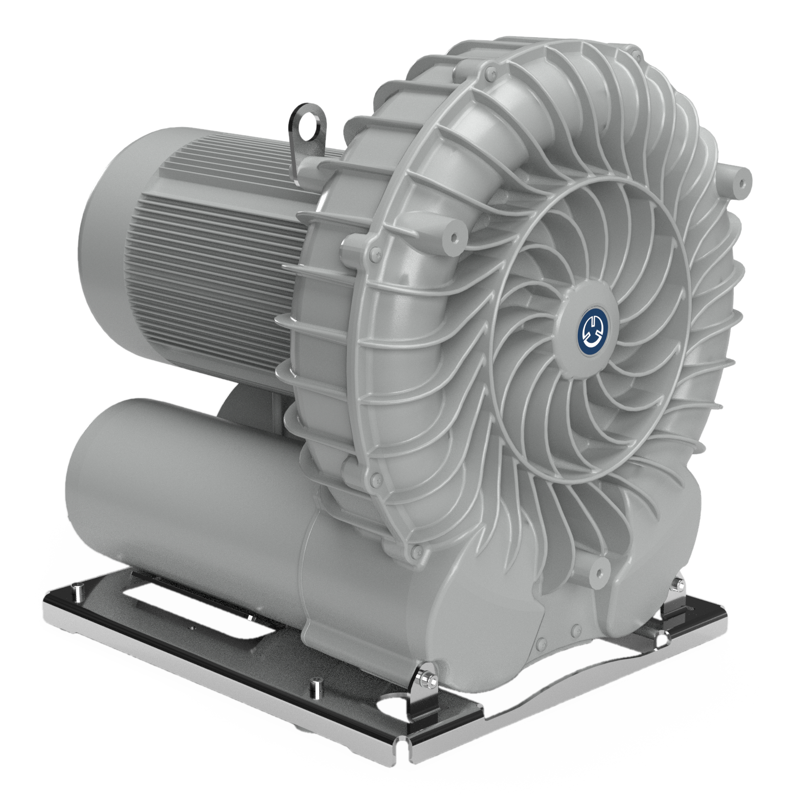 Becker two-stage side channel blower vacuum package with IE3 premium efficiency 12.1 HP, 230/460v, 60 Hz, 3-phase, TEFC (IP55) motor. Standard features include heavy duty construction, integrated inlet and discharge silencers for quiet operation, and a UL/CSA listed motor with class F insulation. This fully-assembled, high-quality blower package is complete with an inlet vacuum filter, relief valve with filter, and vacuum gauge.