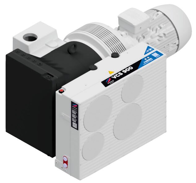 Elmo Rietschle oil-lubricated rotary vane vacuum pump with coupling and flange to accomodate a C-face NEMA motor. Standard features include a fine/coarse vacuum adjustment valve, special alloy vanes, non-return valve, gas ballast valve, easy access exhaust oil separator with replaceable elements, back pressure gauge, sound attenuating cover, and initial fill of oil. An inlet filter is highly recommended and sold separately.